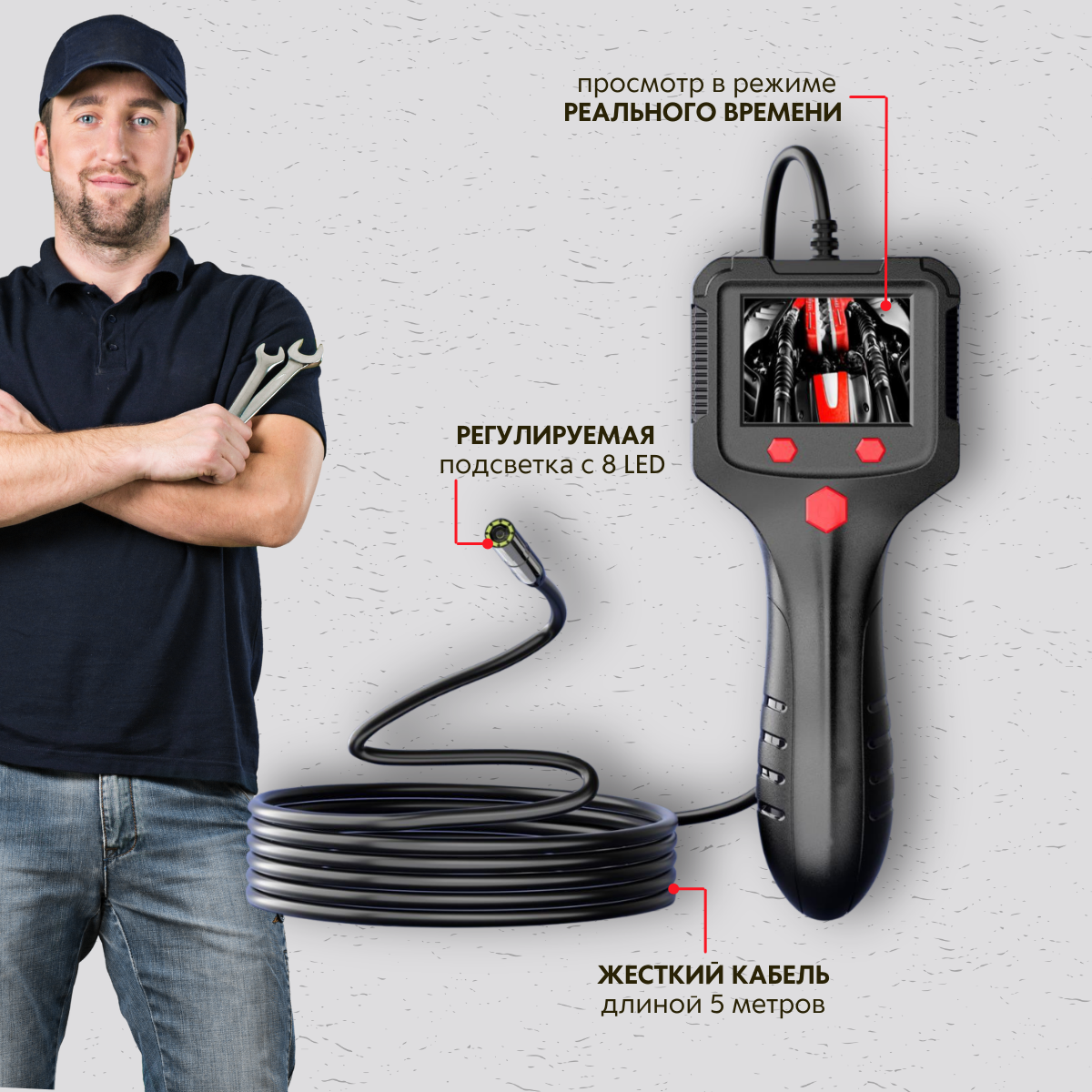 | Комплектация | Эндоскоп; Объетив 8 мм; Кабель для зарядки; Крюк; Магнит; Боковое зеркало |