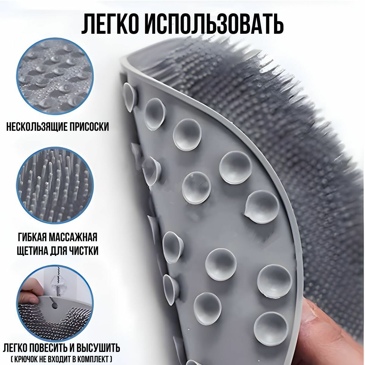 Силиконовая массажная мочалка коврик, серая, для мытья тела и ног на присосках для душа, ванны и сауны. Мочалка для спины. Антибактериальная щетка пилинг информация: