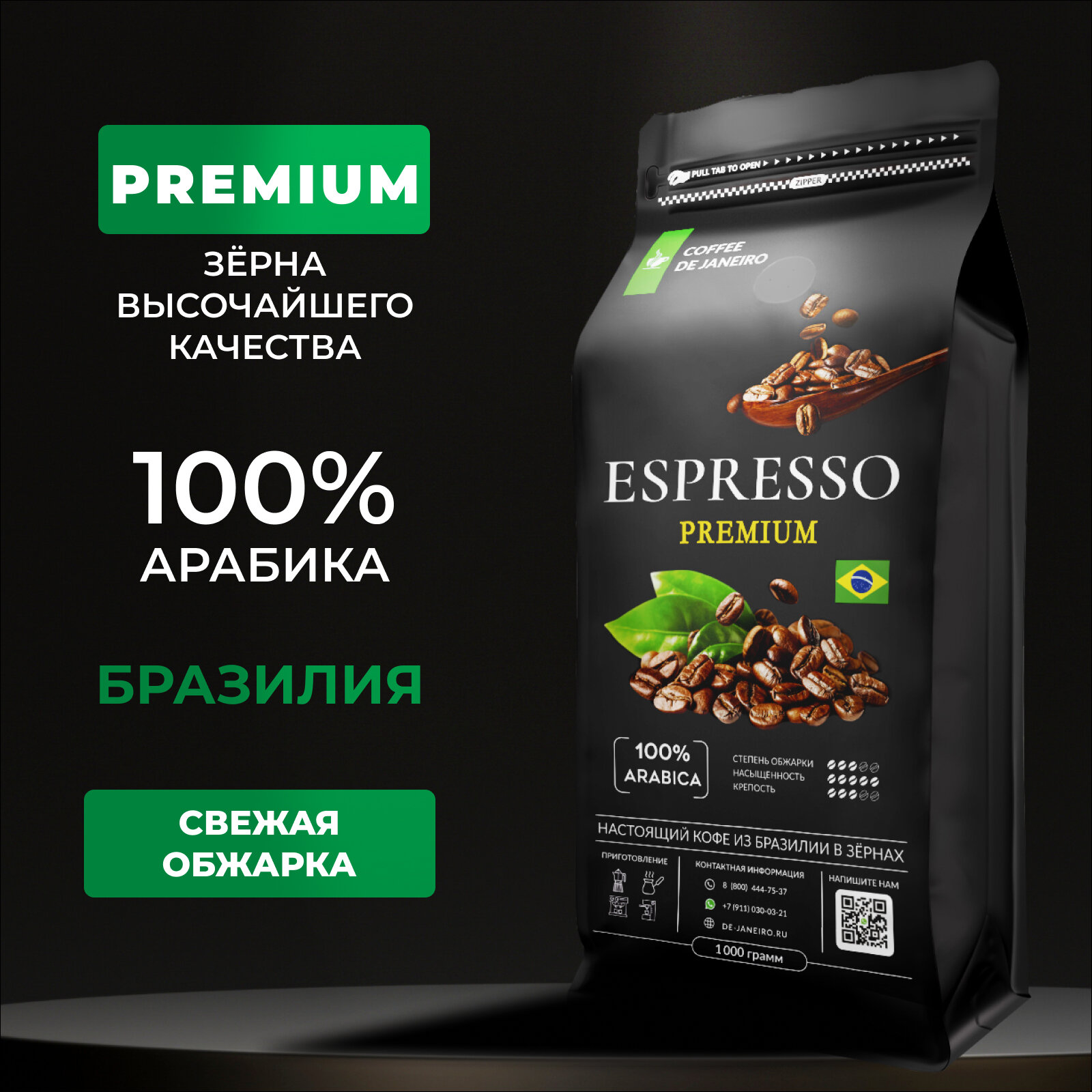 Кофе в зернах 1 кг 100% Арабика DE JANEIRO ESPRESSO PREMIUM (Бразилия, Сул де Минас), свежеобжаренный зерновой кофе информация:
