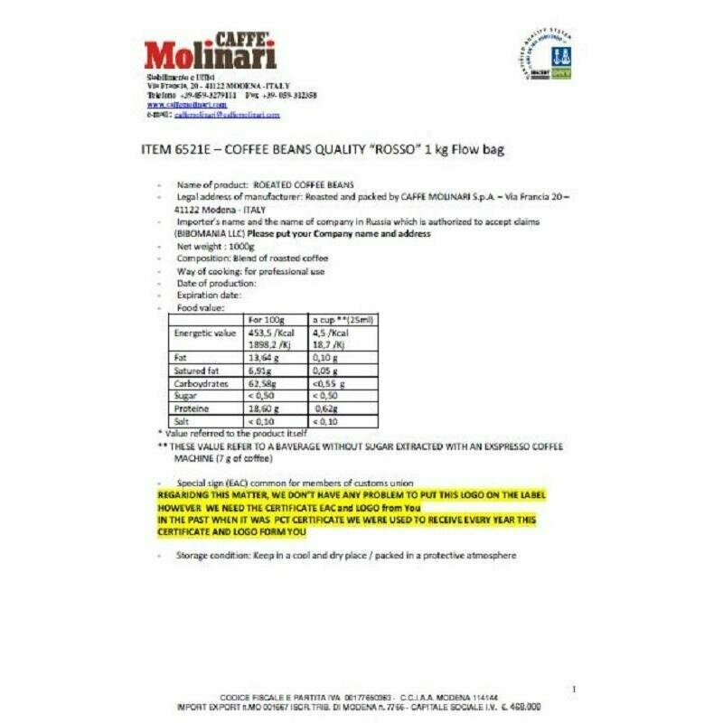 MOLINARI Кофе в зернах Molinari Rosso 1 кг информация: