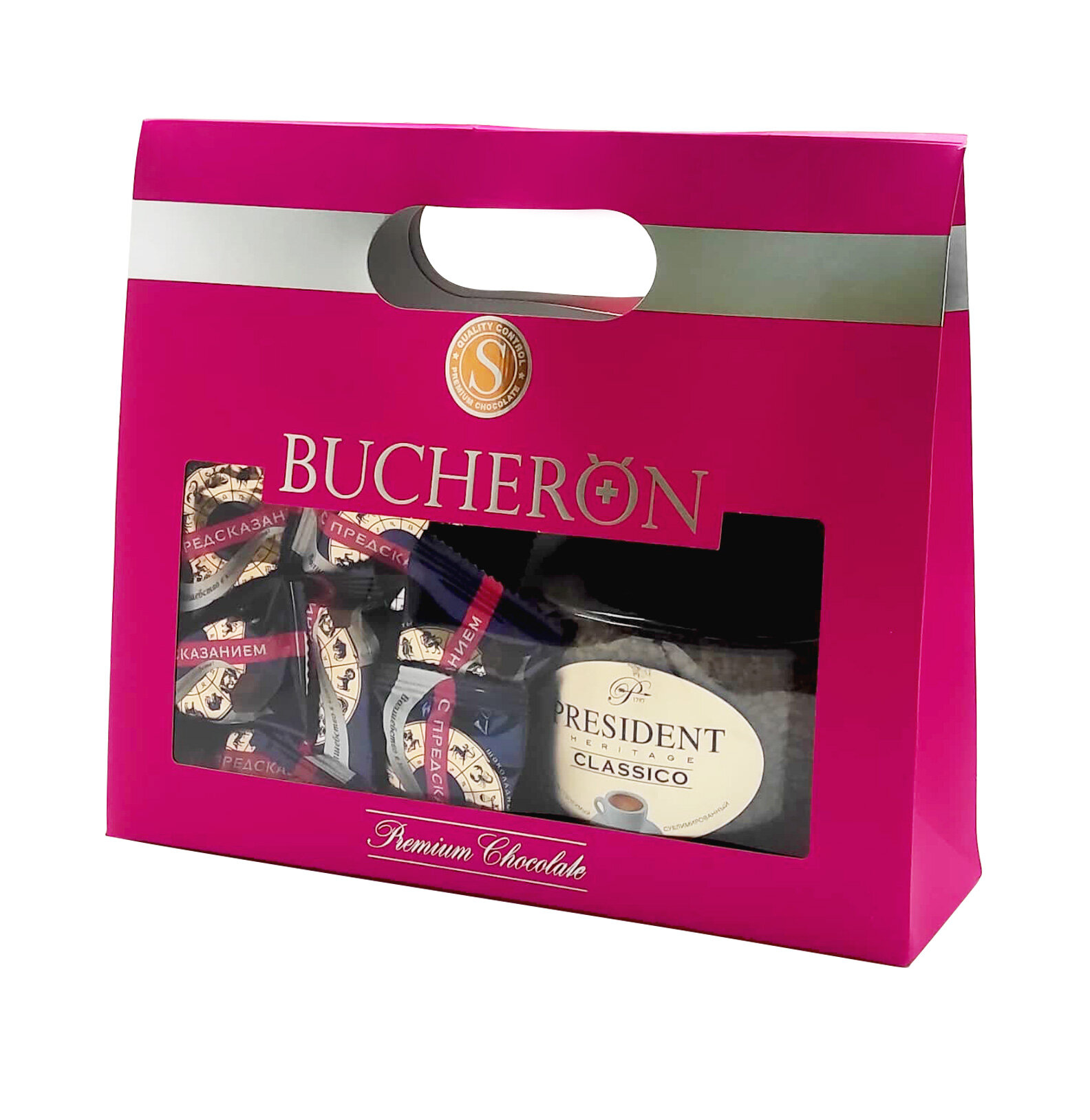Подарочный набор SOBRANIE (Кофе PRESIDENT HERITAGE Classico 100гр и Конфеты с предсказаниями) розовая сумочка информация: