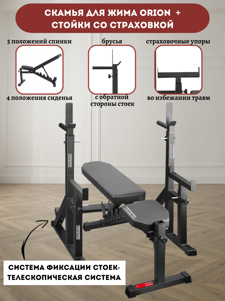 Скамья для жима Orion Черная + Стойки со страховкой Телескопические Черные информация: