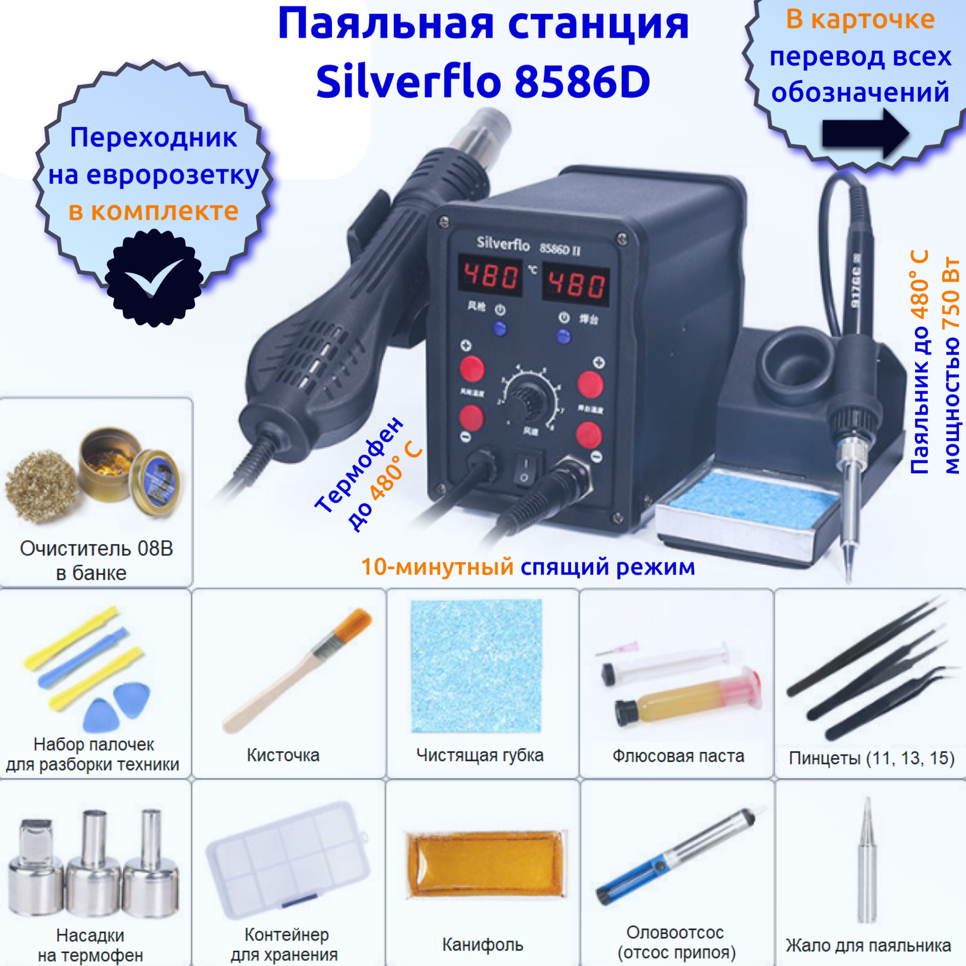 Паяльная станция Silverflo 8586D-II с термофеном и цифровыми дисплеями (китайская версия, с переходником на евророзетку) информация:
