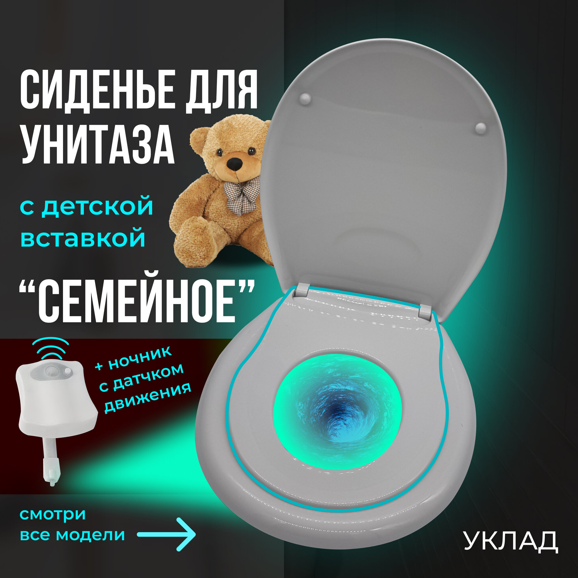 Сиденье для унитаза Семейное С подсветкой (2 в 1 Детское и Взрослое) Крепление 158 мм, Длинна 408 мм, Ширина 362 мм "Уклад" информация: