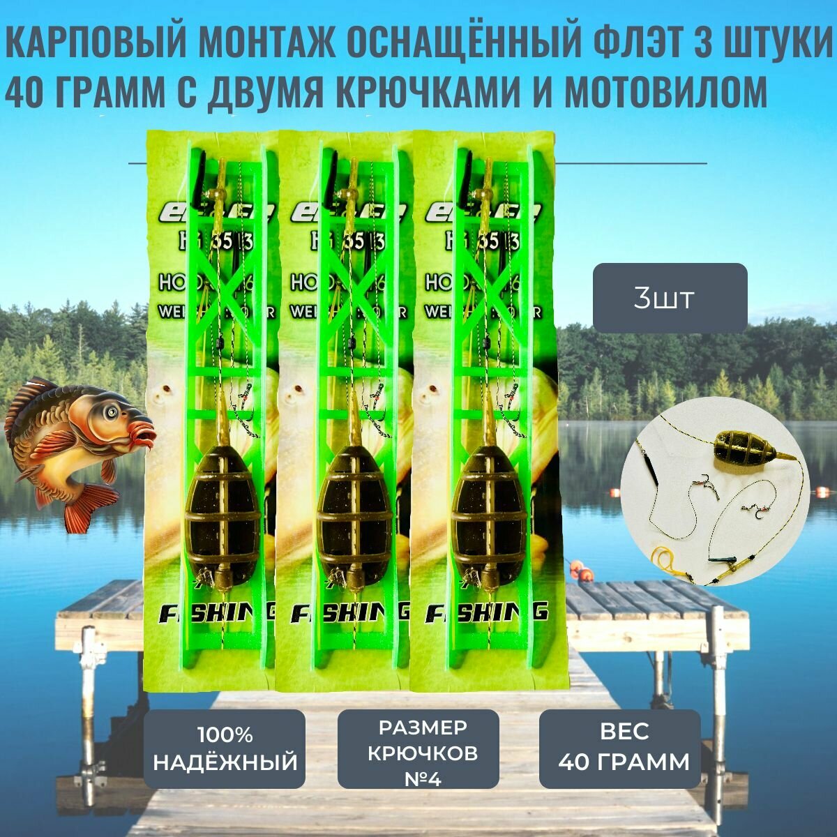 Карповый монтаж оснащённый флэт метод 3 штуки 40 грамм с двумя крючками и мотовилом информация: