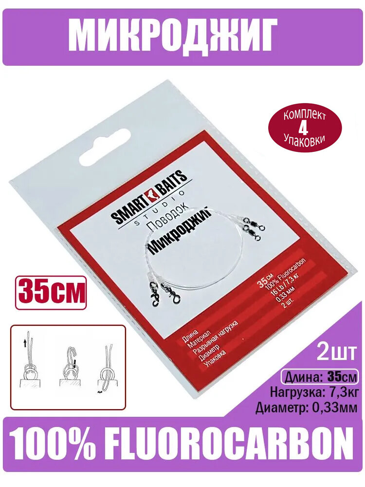 Поводок Микроджиг 35см Флюорокарбон 2шт/уп 4 уп Smart Baits Studio, снасть Лайт Ультралайт для джига, спиннинг снасть для рыбалки информация: