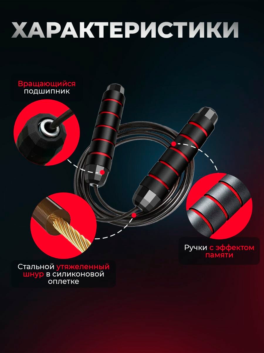 Скакалка спортивная для фитнеса красная, скакалка взрослая скоростная с металлическим шнуром и подшипником, 2,8 м информация: