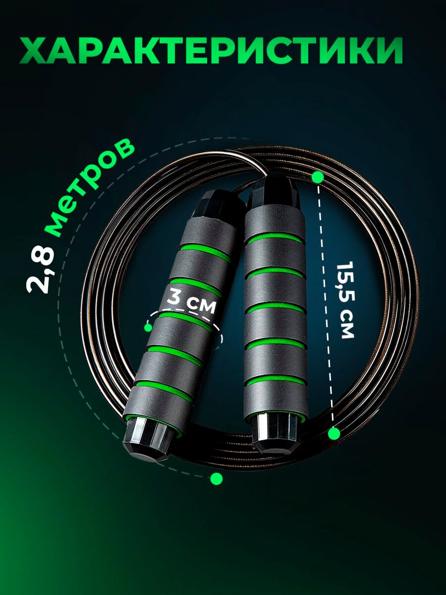 Отзывы на Скакалка спортивная для фитнеса зеленая, скакалка взрослая скоростная с металлическим шнуром и подшипником, 2,8 м