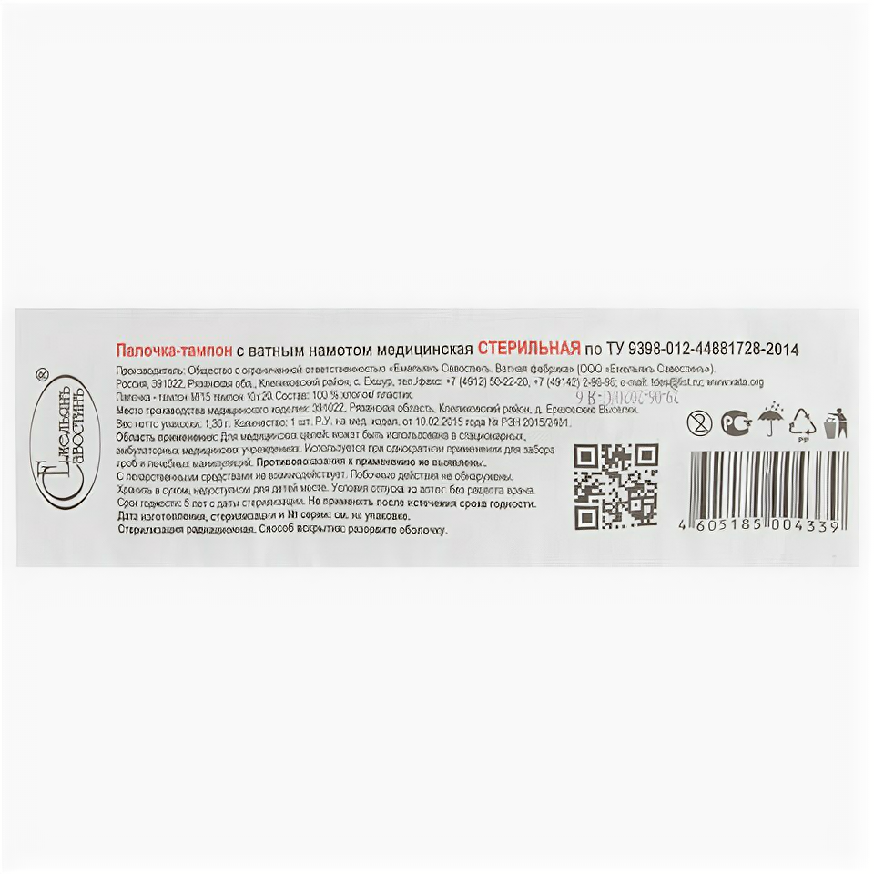 Зонд-тампон пластик/хлопок намотка 10 мм стерильный емельянъ савостинъ, индивидуальная упаковка длина 150 мм (цена за 100 ед.товара) информация: