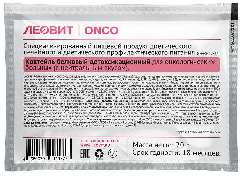 Леовит Onco (Е) Коктейль белковый Детоксикационный с нейтральным вкусом пакет 20 г 1 шт информация: