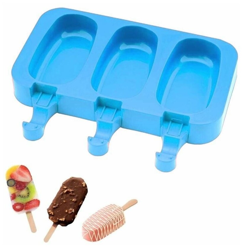 Силиконовая форма для мороженого "Эскимо", 3 ячейки, голубой информация: