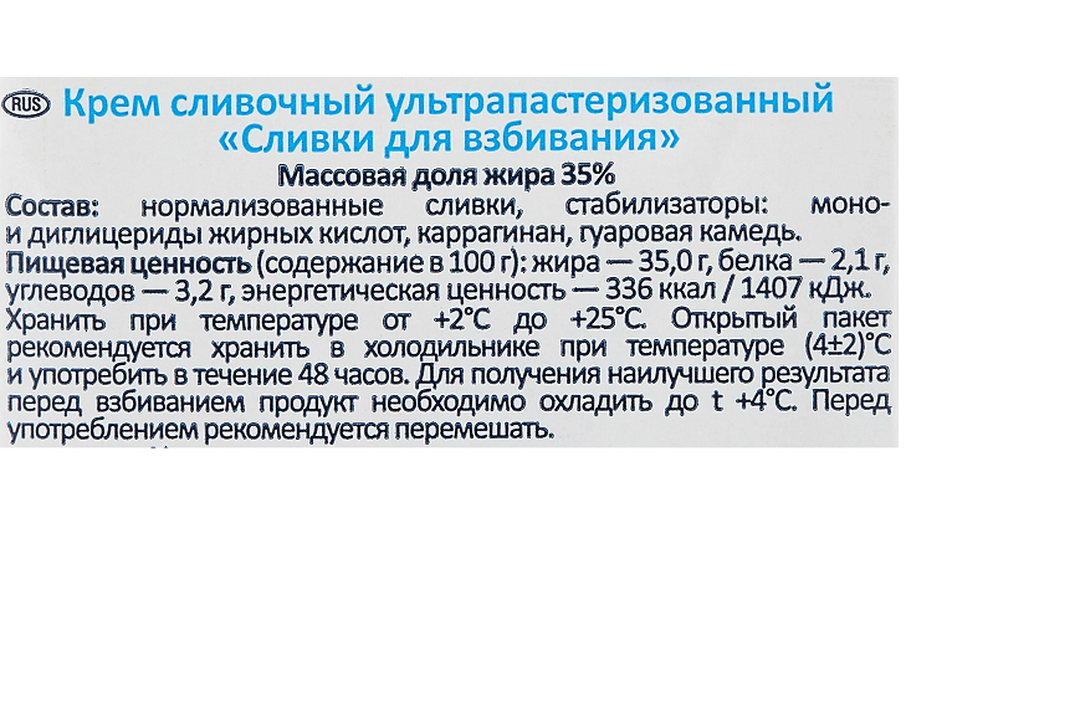 | Состав | нормализованные сливки, стабилизаторы: моно-диглицериды жирных кислот, каррагинан, гуаровая камедь |