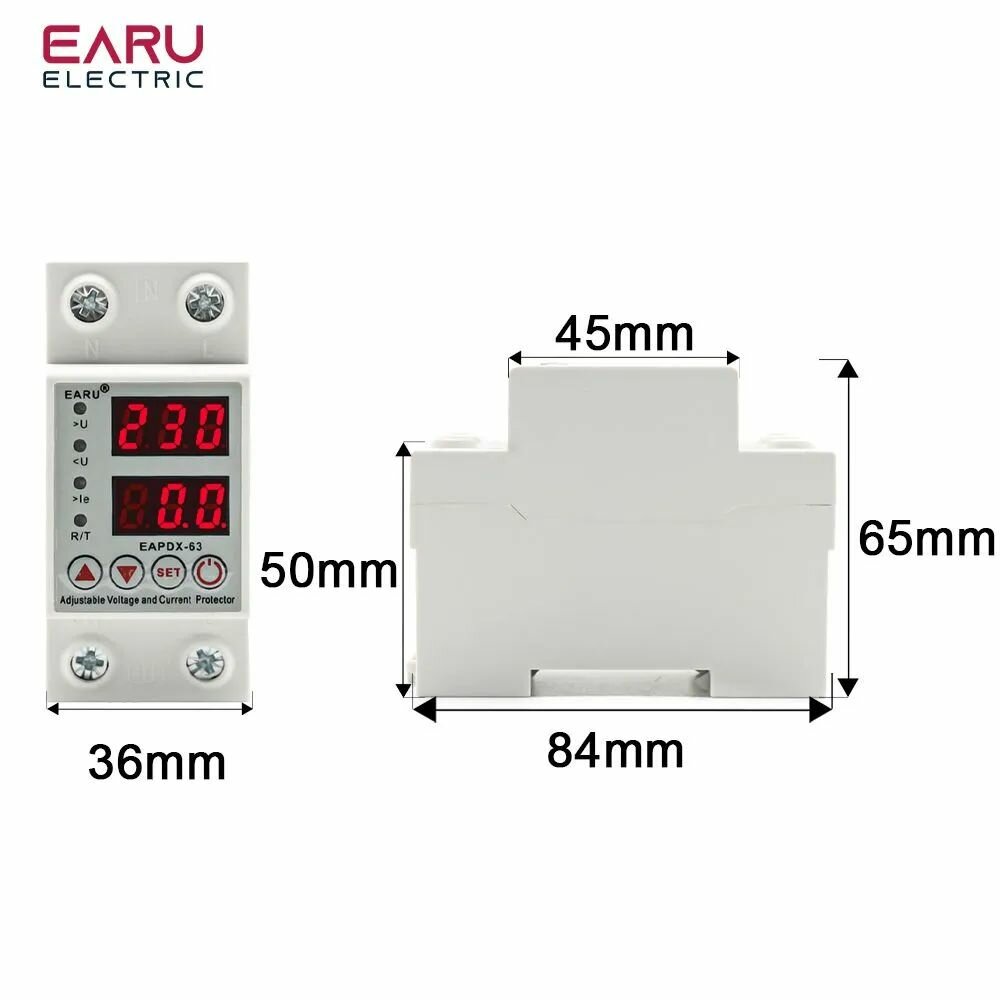 Реле контроля напряжения EAPDX-63А (однофазное) с защитой перегрузки по току, контроль фаз на DIN (ДИН) рейку, модульное. информация:
