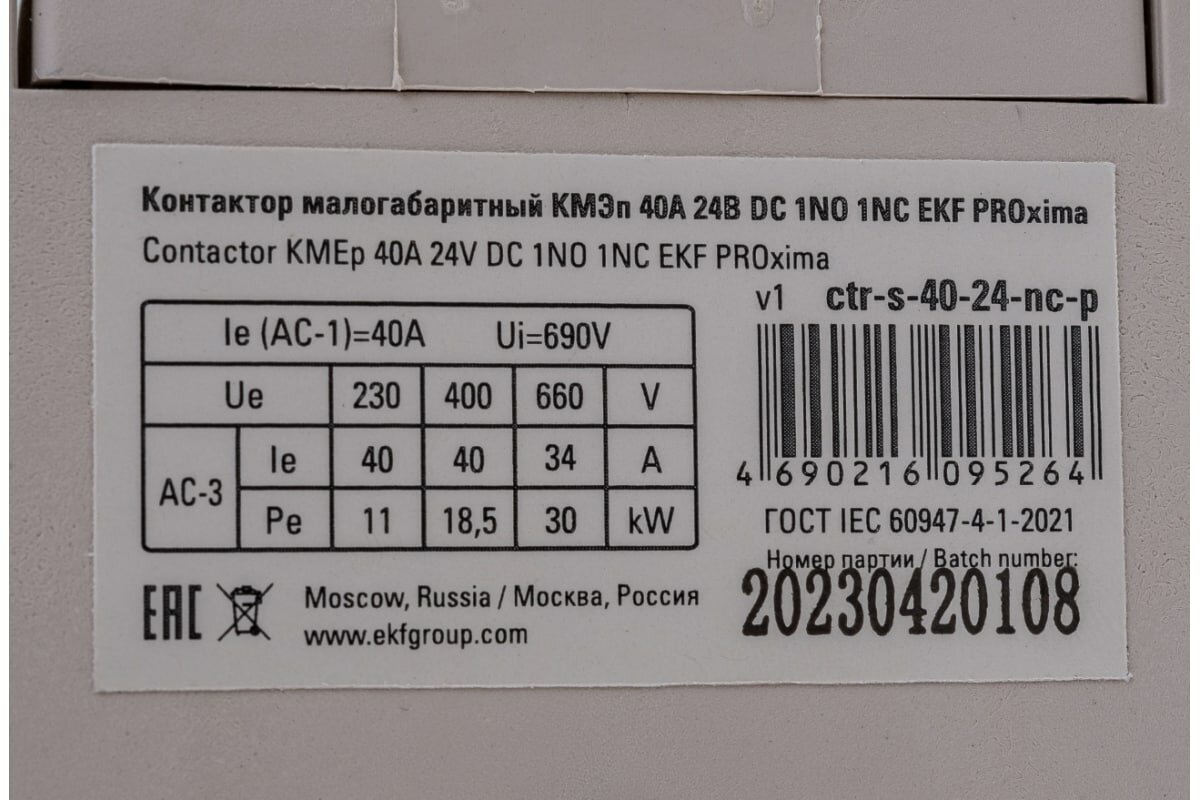 Контактор КМЭп малогабаритный 40А 24В DC 1NO 1NC EKF PROxima информация: