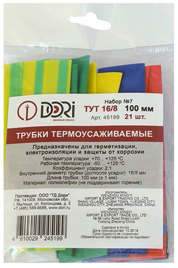 | Дополнительная информация | Набор термоусадочных трубок DORI Тут d 6/3 10см 21шт. разноцвет |