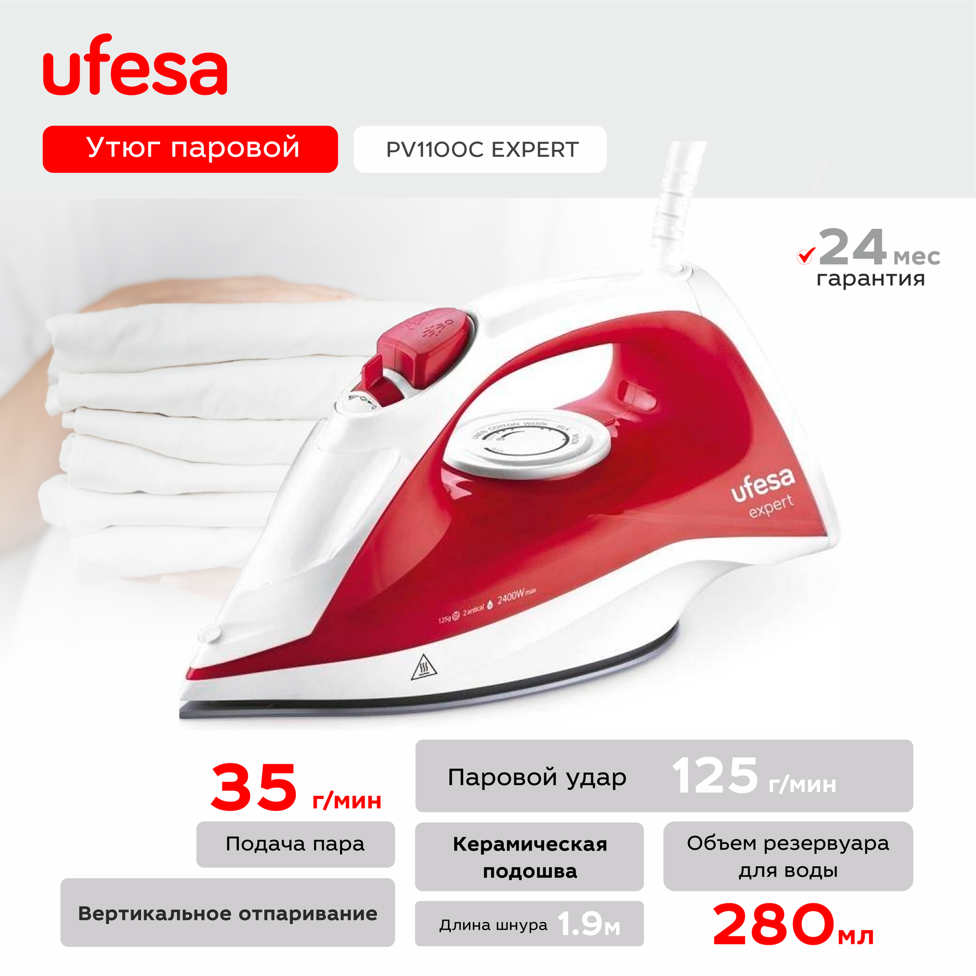 Утюг паровой UFESA PV1100C EXPERT, красный/белый информация:
