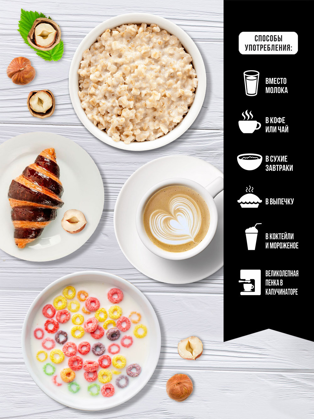 | Состав | орехово-зерновая смесь (вода питьевая, рисовая крупка, ядра орехов фундука, соевый белок(изолят)); подсолнечное масло, кокосовое масло, регулятор кислотности – орто-Фосфат калия 2-замещенный; эмульгатор – лецитин соевый; соль морская пищевая, стабилизаторы – геллановая камедь, каррагинан; натуральный ароматизатор. |