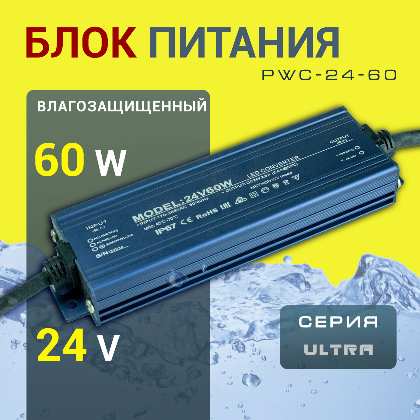 Водонепроницаемый импульсный блок питания DC 24В для светильника светодиодной ленты или LED лампы 24 Вольт 60 Ватт информация: