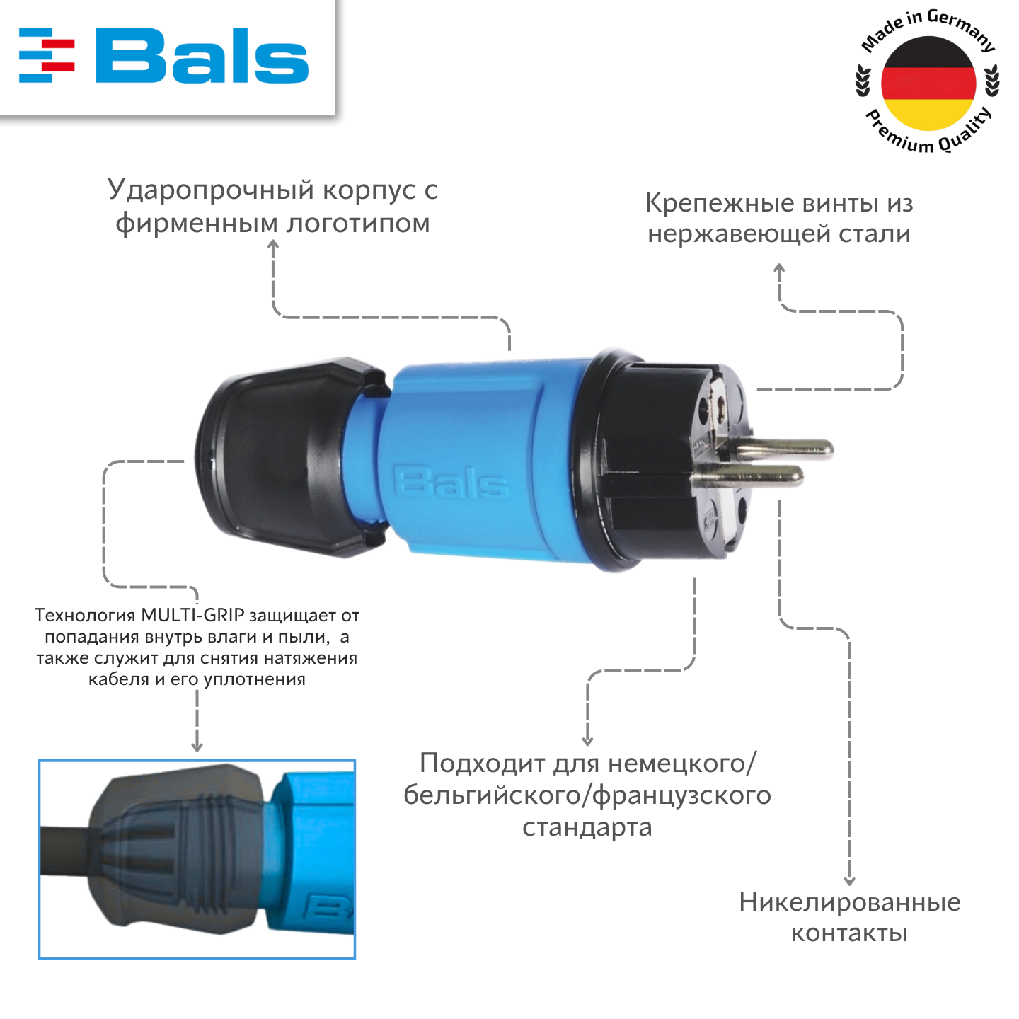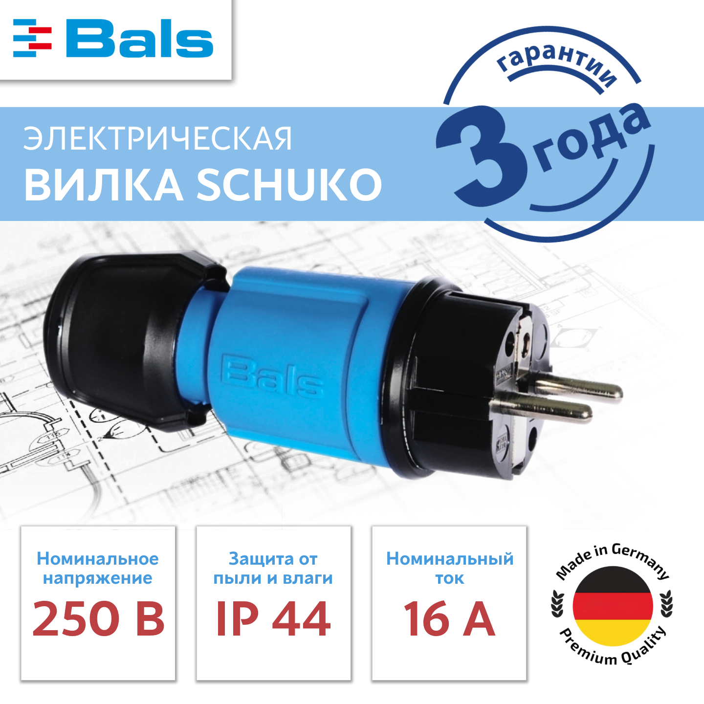 Вилка бытовая BALS SCHUKO 16A 3p (2P+E) 250V IP44 синяя информация: