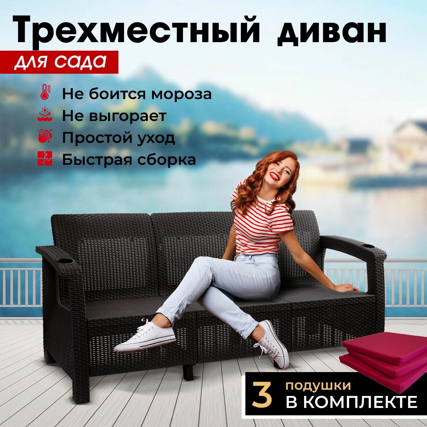 Диван садовый трехместный YALTA (Ялта Ротанг-плюс) + 3 коричневые подушки (искусственный ротанг (пластик)