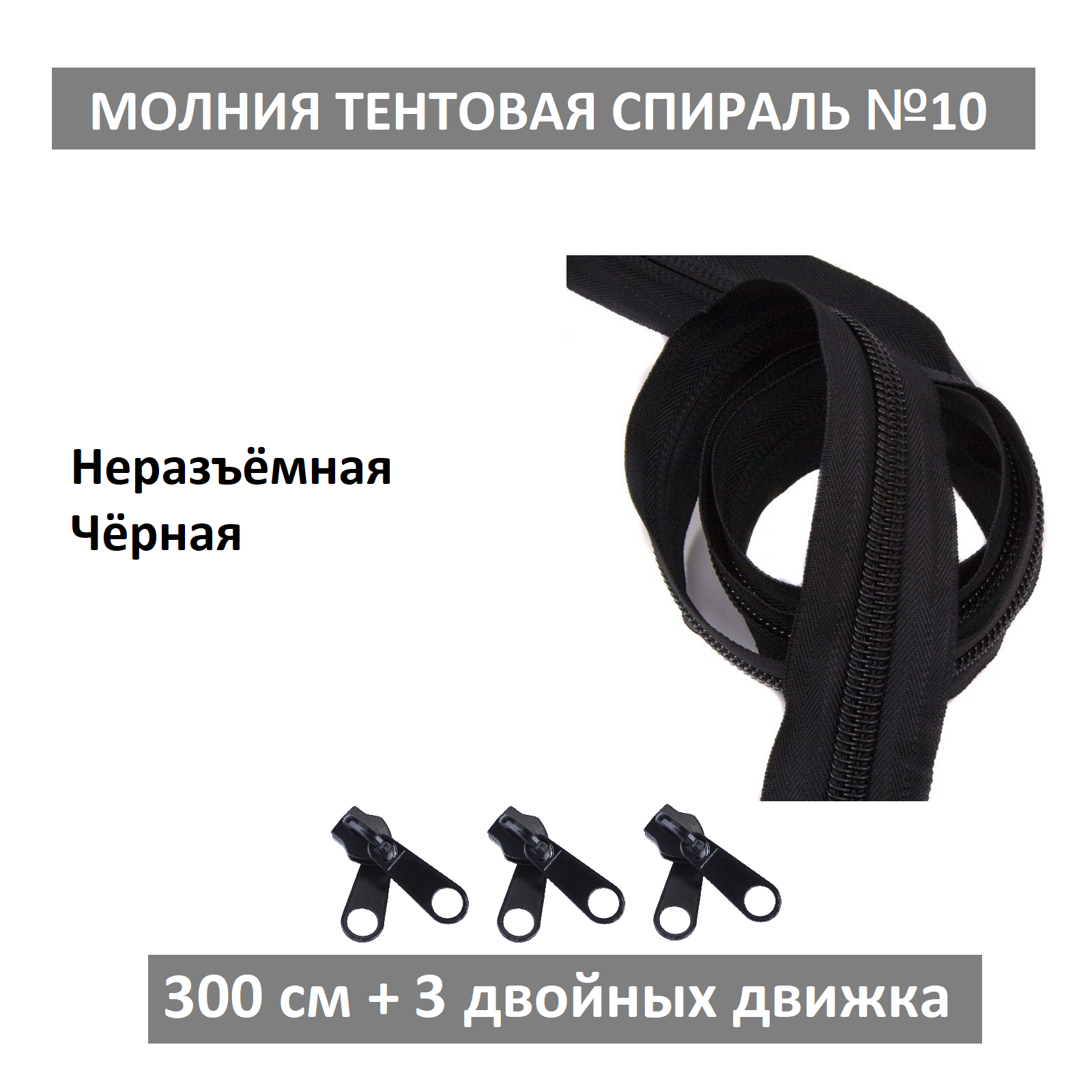 Молния тентовая неразъемная черная №10 300 см., 3 бегунка в комплекте информация: