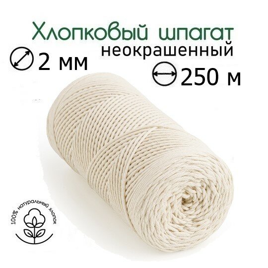 10 цен на Шпагат хлопковый 2 мм 250 м неокрашенный для макраме, вязания, рукоделия