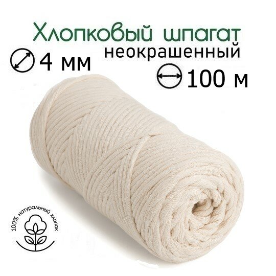 10 цен на Шпагат хлопковый 4 мм 100 м неокрашенный для макраме, вязания, рукоделия