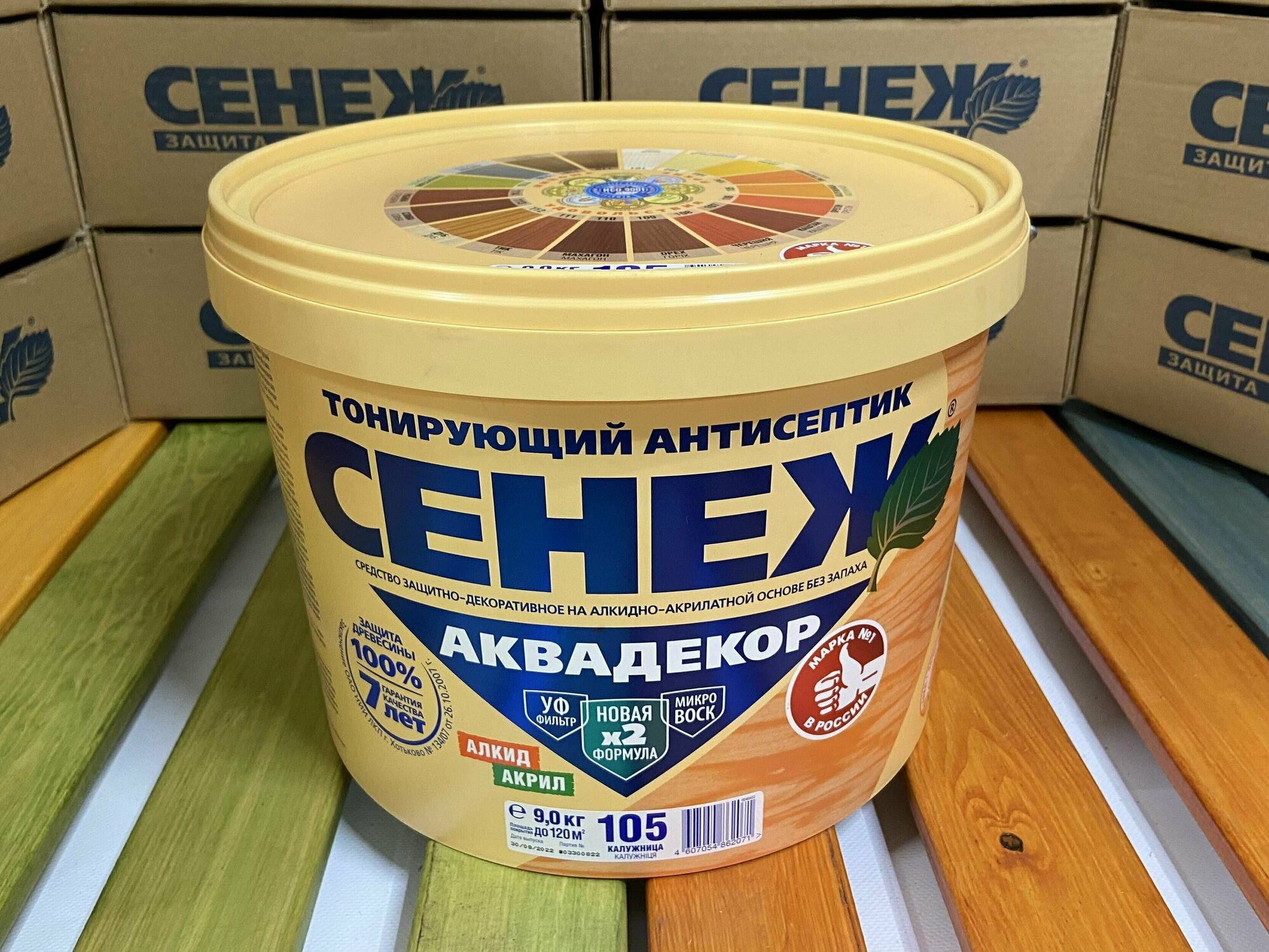 Сенеж аквадекор. Цвет 109 Орех. Тонирующий антисептик на алкидно-акрилатной основе с УФ фильтром и воском для долговременной защиты и отделки древесины. Ведро массой нетто 9 кг.