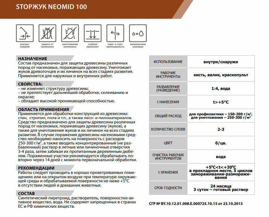 | Дополнительная информация | для профилактической защиты расход составляет 150-200 г/м2; 250-300 гр/м² — уничтожение насекомых; разводится водой в соотношении 1:4; хранить в проветриваемом помещении в плотно закрытой заводской таре, при температуре от +5°С до +30°С; 5 циклов замораживания-размораживания; избегать попадания солнечных лучей и нагрева; срок хранения готового раствора 3 дня; не допускать попадания препарата в водоемы, сточные воды, грунт; утилизация согласно СанПиН 2.1.7.1322-03, используется для обработки конструкций из древесины (брусья, стропила, полы и др.), для обработки лесо- и пиломатериалов |
