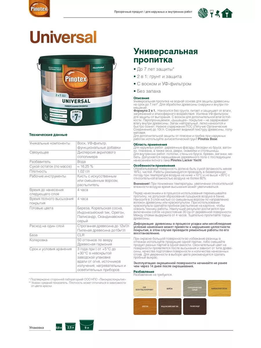 Универсальная пропитка на водной основе 2в1 для древесины Pinotex Universal полуматовая (9л) карельская сосна информация: