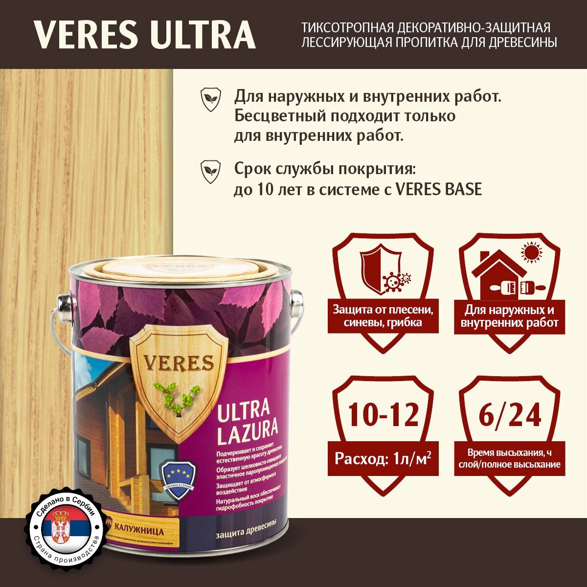 | Дополнительная информация | расход: пиленая древесина на один слой до 10 м2/литр, строганая древесина на один слой до 12 м2/литр; время высыхания до нанесения следующего слоя: 6 ч |