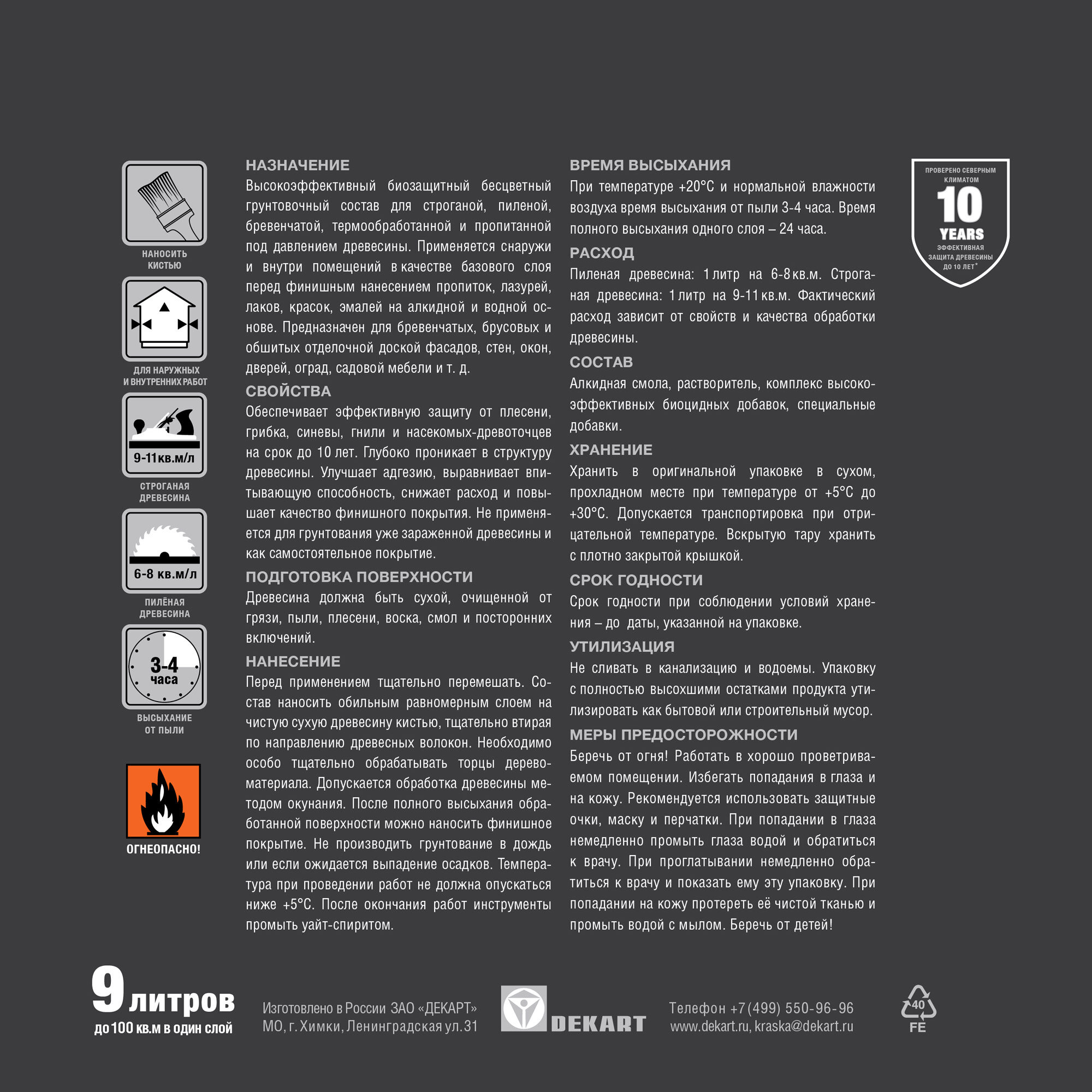 | Дополнительная информация | • Бесцветный биозащитный алкидный грунт-антисептик для наружных и внутренних работ по древесине. • Применяется в качестве базового слоя перед финишным нанесением пропиток, лазурей, лаков, красок, эмалей на алкидной и водной основе. • Обеспечивает эффективную защиту от плесени, грибка, синевы, гнили и насекомых-древоточцев на срок до 10 лет. |