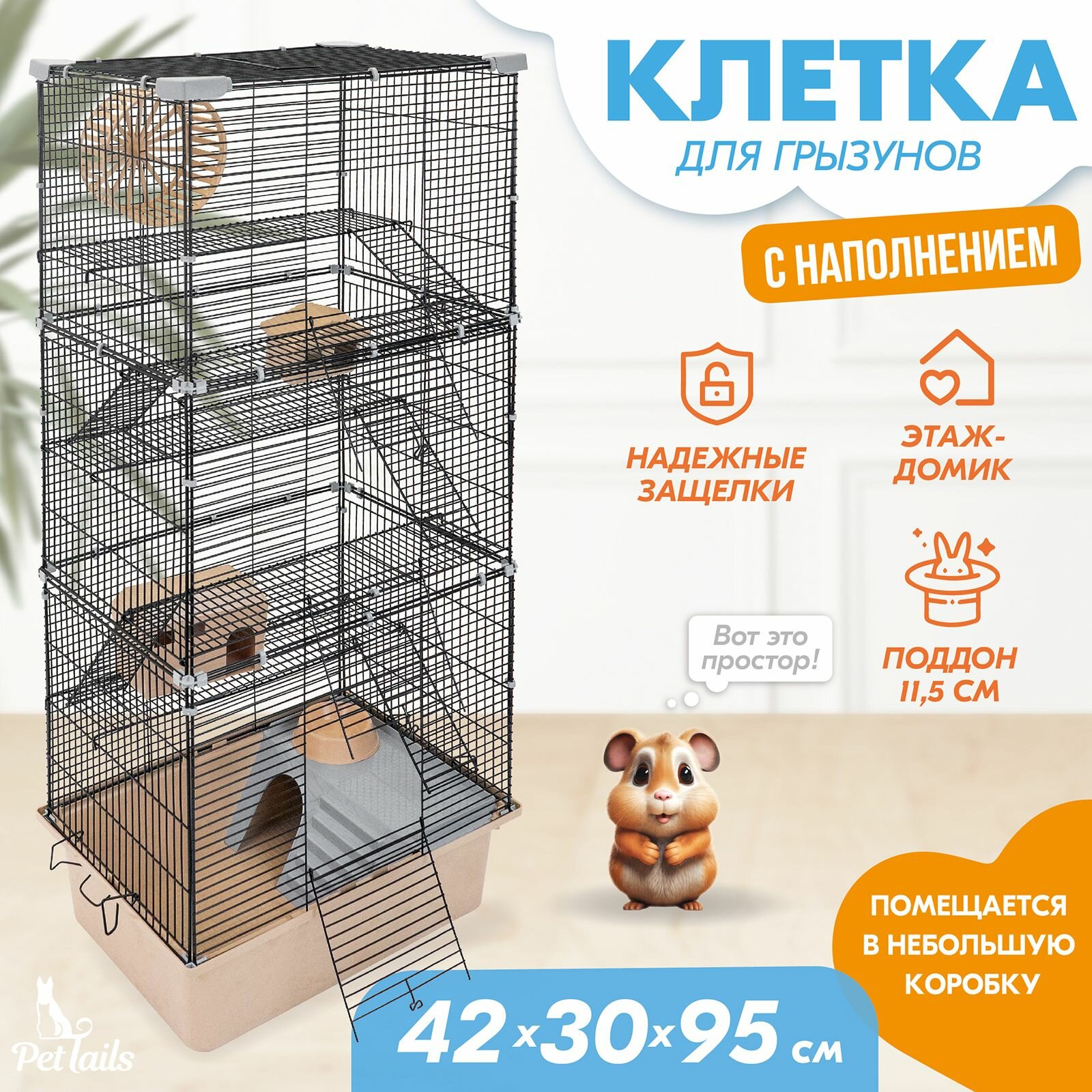 10 цен на Клетка для грызунов "PetTails" разборная, шаг прута 10,5мм, 42*30*h95см, 5 этажей (+полка-домик, колесо, миска, 2 пласт. домика) бежевая