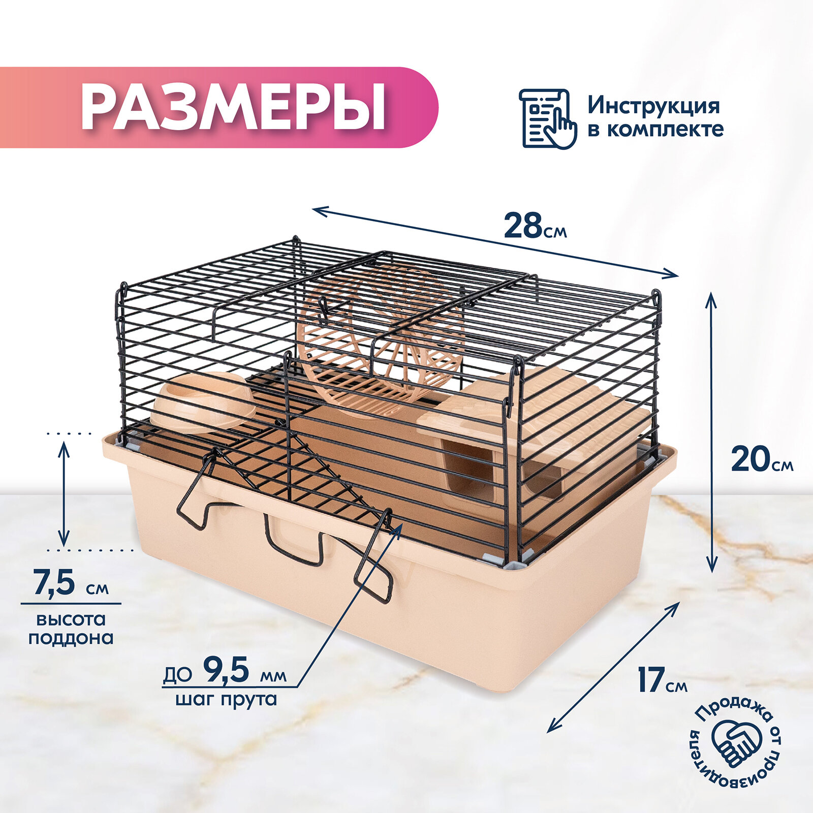 10 цен на Клетка-мини д/мелких грызунов "PetTails", складная, шаг прута до 9,5мм, 28*17*h20см (+домик, миска, колесо) бежевая