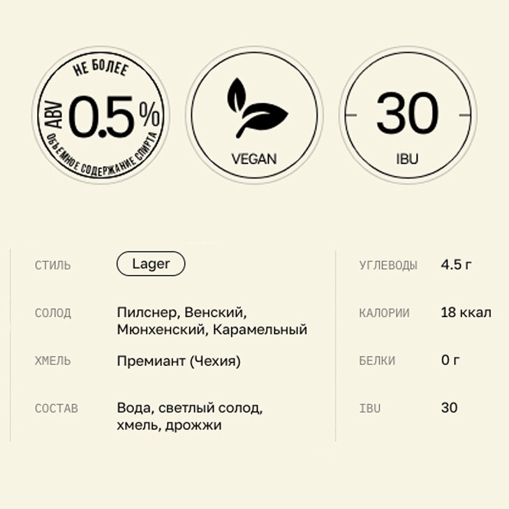 | Состав | Вода, солод пивоваренный ячменный (светлый), хмель, дрожжи пивные |