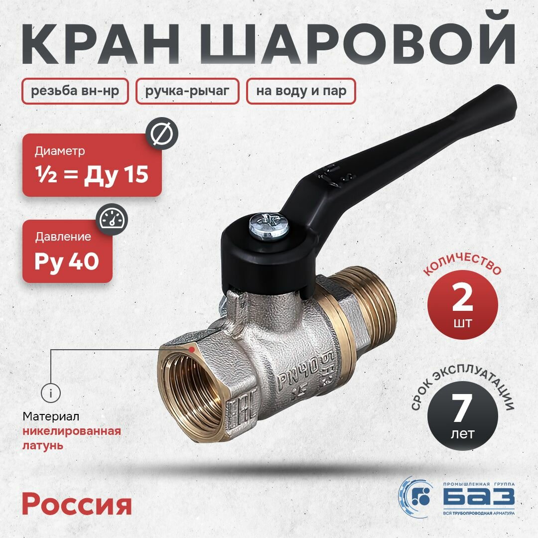 Кран шаровой БАЗ 1/2" (Ду15) 2шт латунный - никелированный, резьба вн-нр, ручка-рычаг информация: