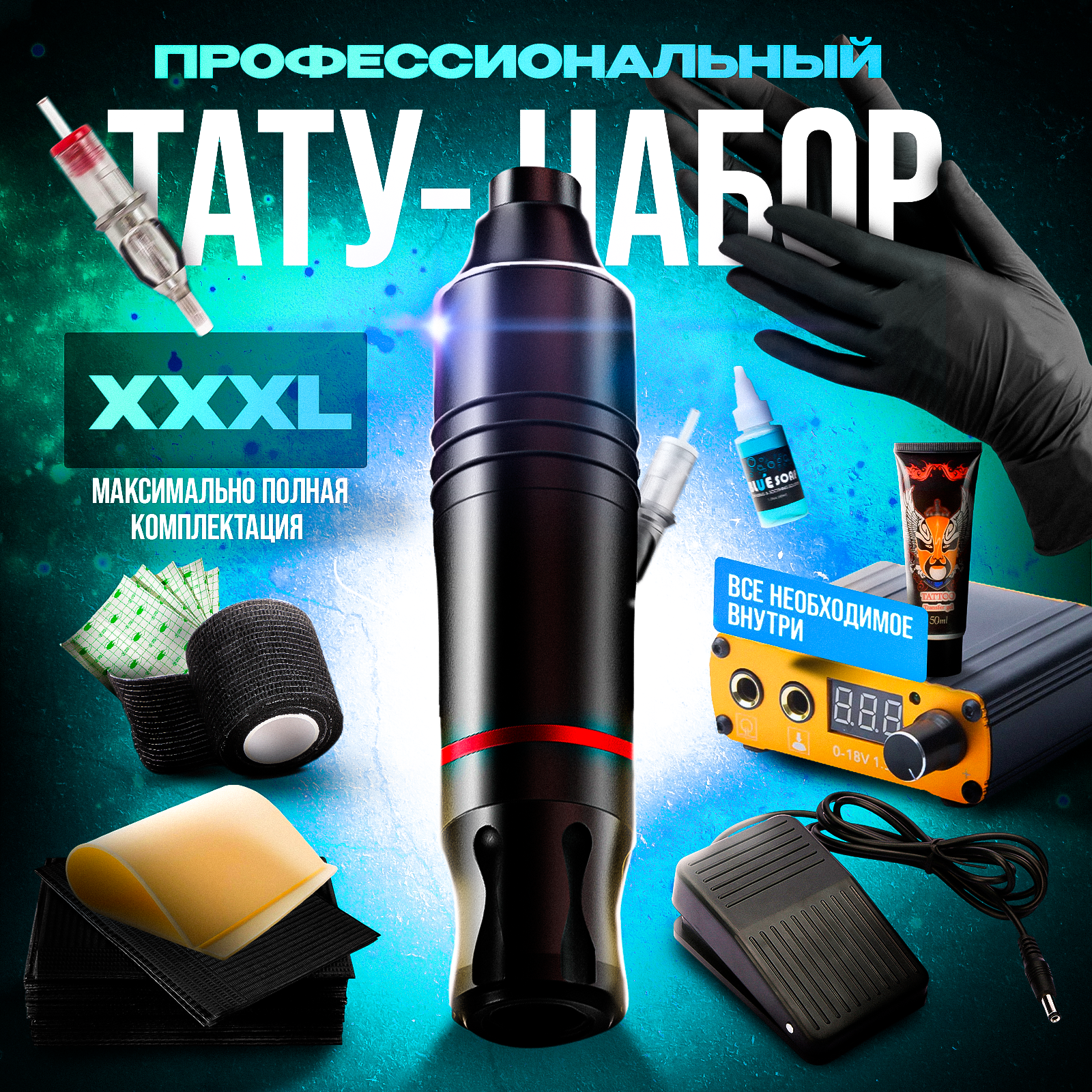 | Комплектация | машинка, блок питания, педаль, картриджи - 10шт., краска цветная - 20шт., краска черная - 1шт., колпачки, кожа, трансферный гель, трансферная бумага, перчатки, барьерная защита, антибактериальное мыло, вазелин, бандажный бинт, заживляющая пленка, коврик для стола, салфетки спиртовые, заживляющая мазь |