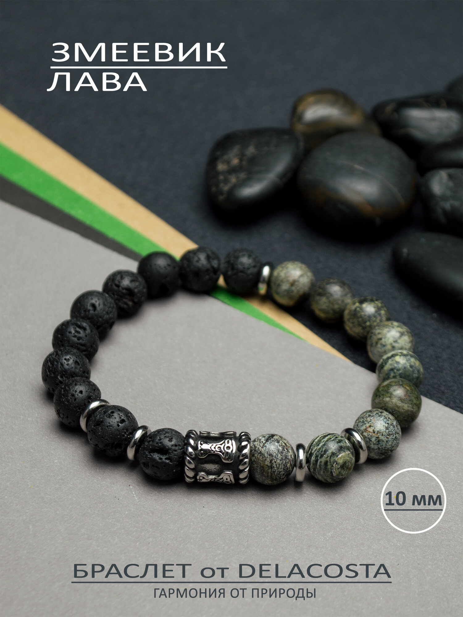 Браслет DELACOSTA, змеевик, вулканическая лава, 1 шт., размер 22 см, зеленый/черный 1 500 ₽