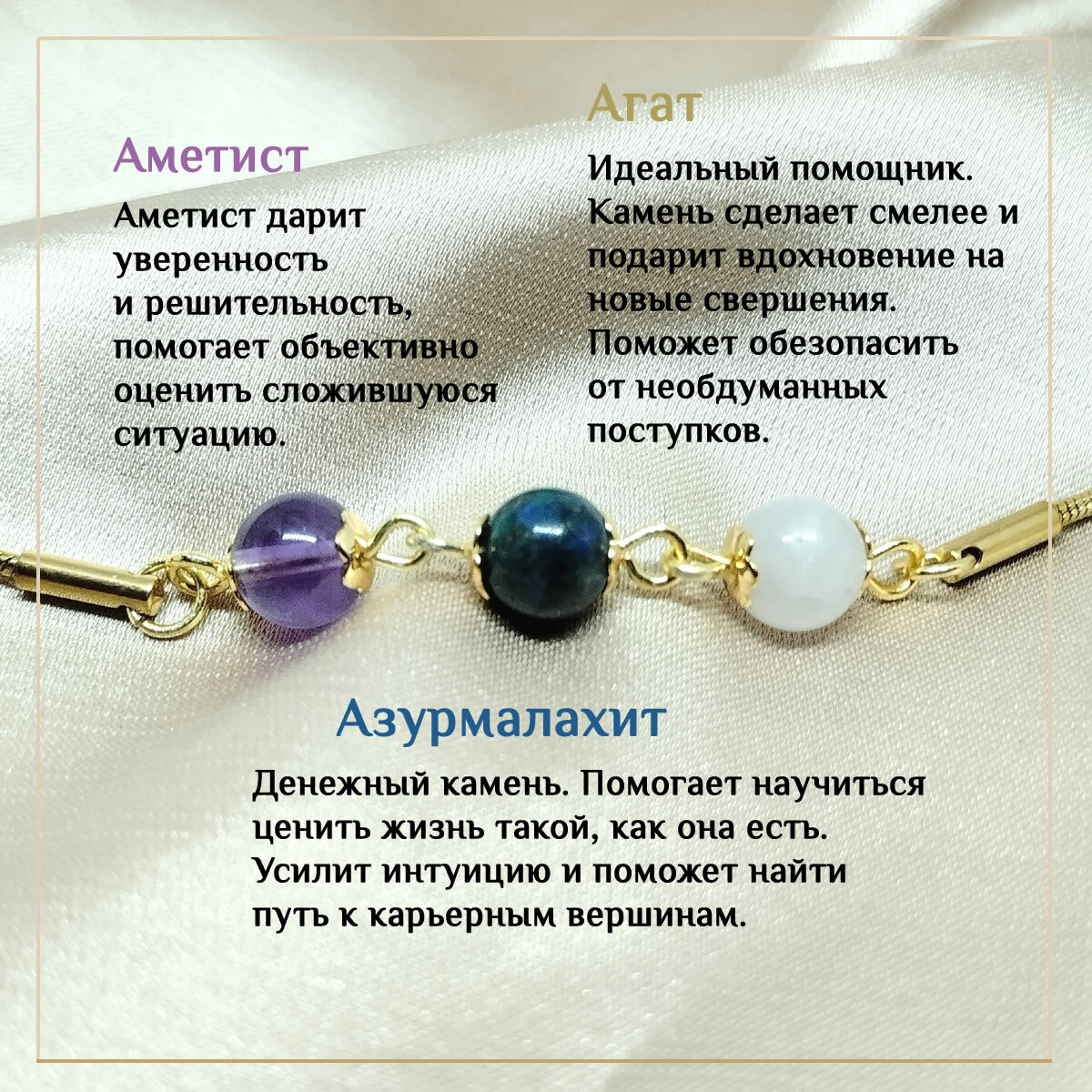 Браслет талисман по зодиаку Козерог. Позолота, натуральные камни: Азурмалахит, Аметист, Агат белый информация: