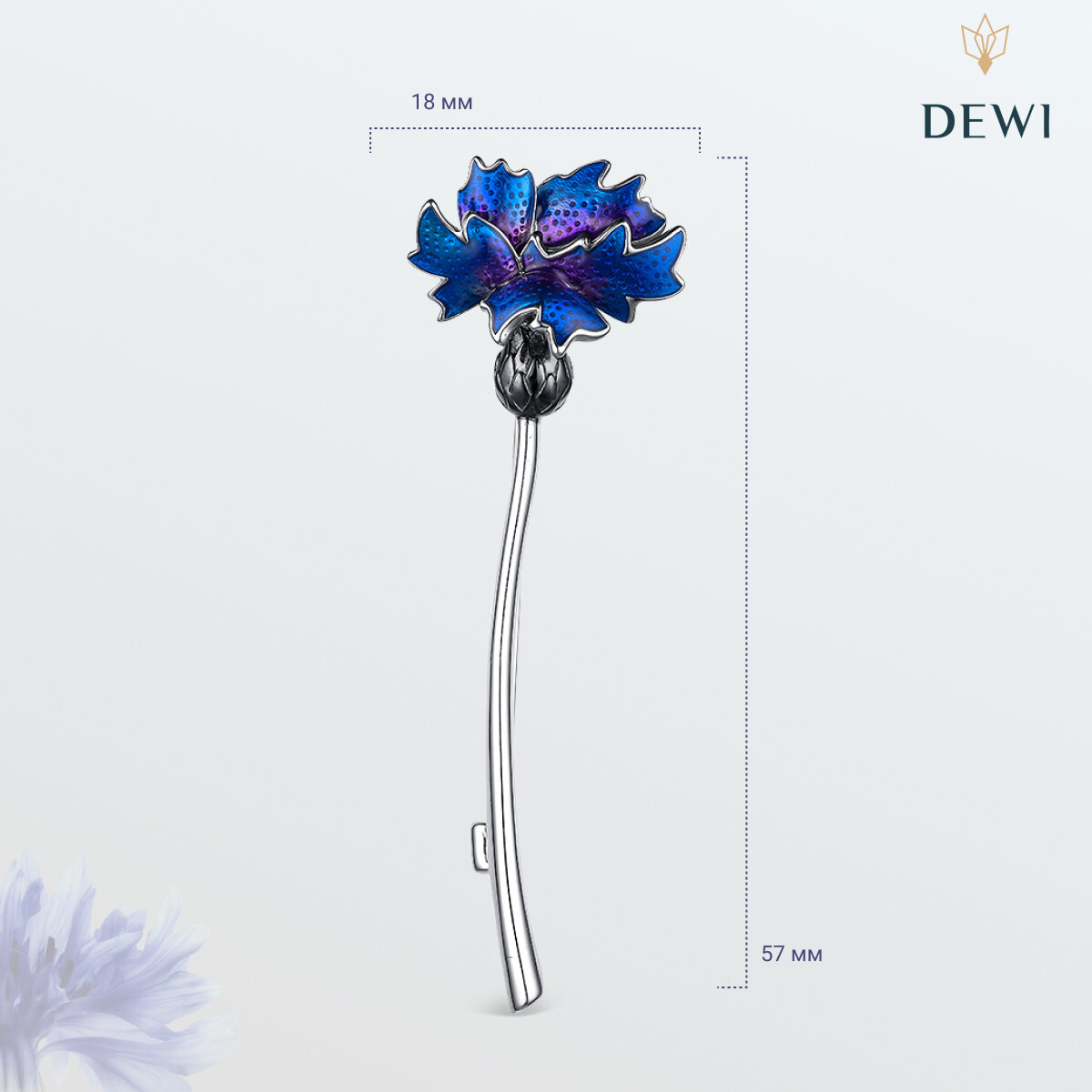 Серебряная женская брошь в виде цветка "Василёк" 925 пробы с эмалью родированная DEWI. информация: