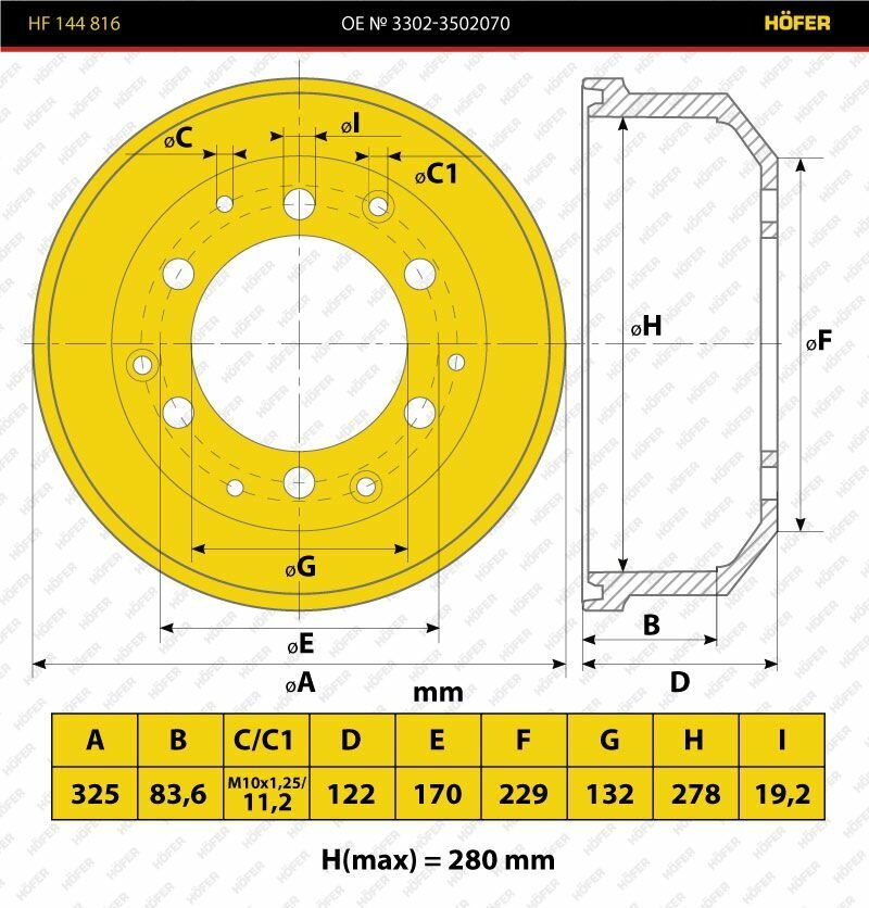 Барабан тормозной Hofer HF 144 816 задний чугун ГАЗ 3302, 2705, 3221 (1шт) информация: