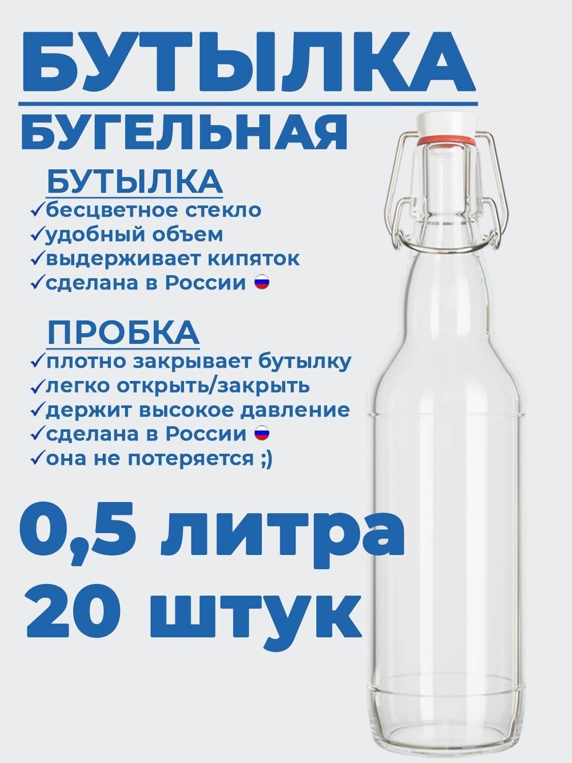 Отзывы на Бутылка стеклянная с бугельной пробкой KHome, бесцветная, 0,5 л, 20 шт
