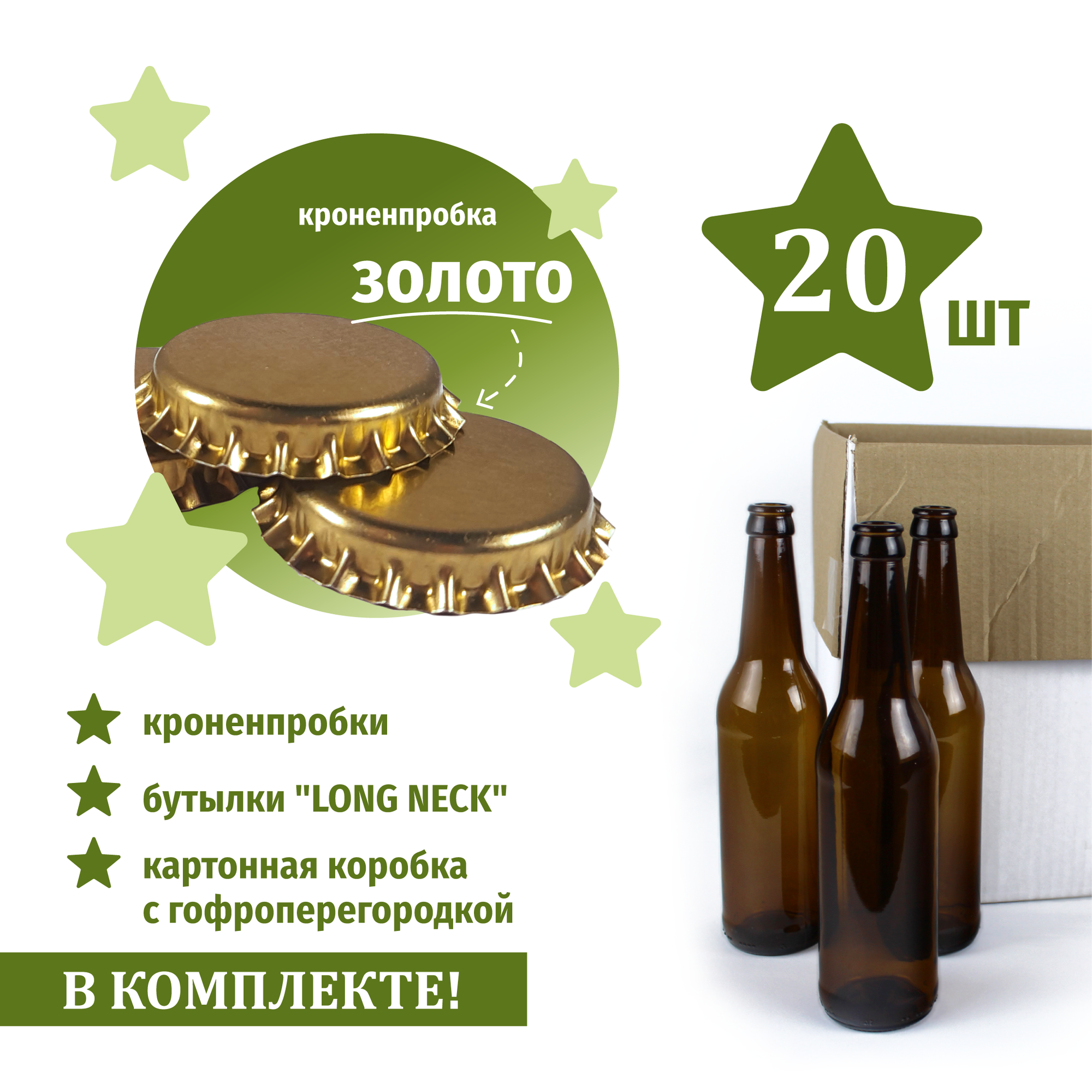 10 цен на Бутылка стеклянная для пива "LONG NECK" из темного стекла, 0,5 л, 20 шт., в комплекте кроненпробка цвета золото