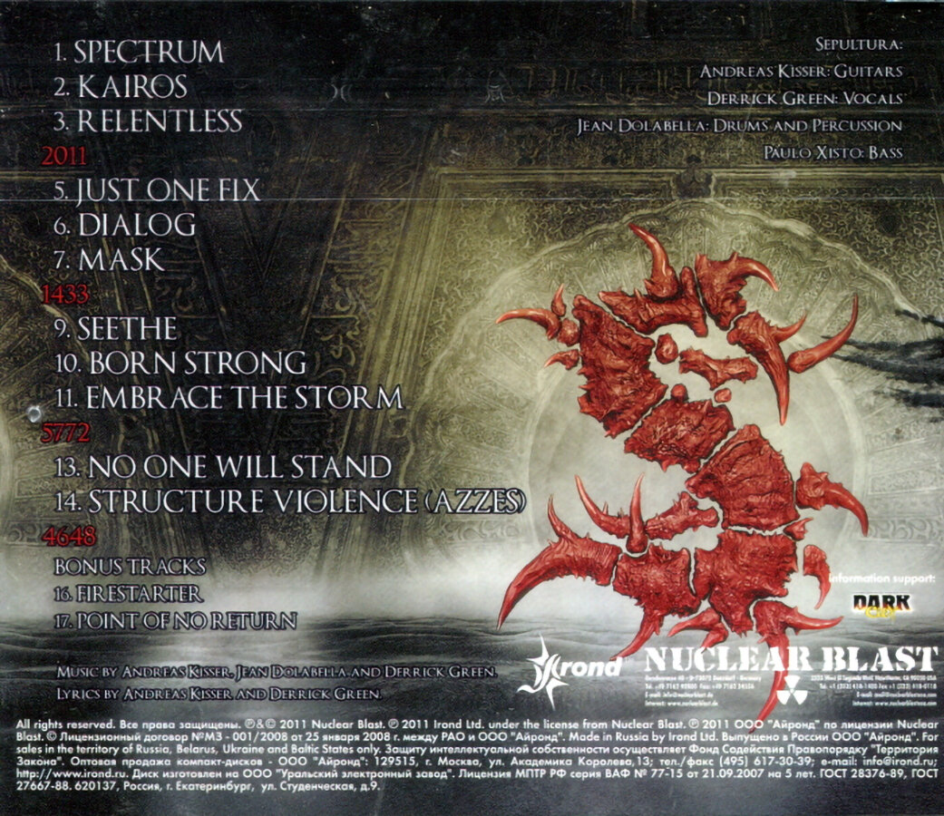 | Треклист | 1. Spectrum 2. Kairos 3. Relentless 4. (2011) 5. Just One Fix (MINISTRY cover) 6. Dialog 7. Mask 8.(1433) 9. Seethe 10. Born Strong 11.Embrace The Storm 12.(5772) 13. No One Will Stand 14. Structure Violence (Azzes) 15.(4648) Bonus tracks: 16. Firestarter 17. Point Of No Return |