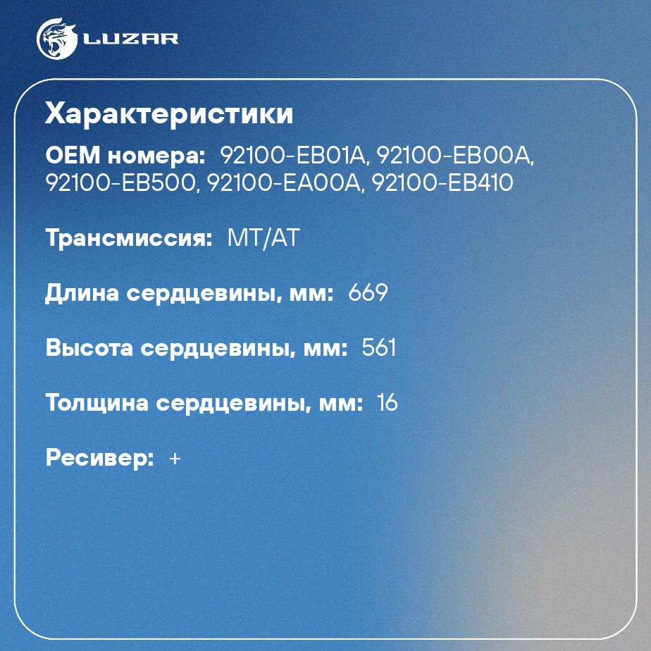 | Дополнительная информация | размер сердцевины, мм: 669*561*16; трансмиссия: M/A; ресивер: + |