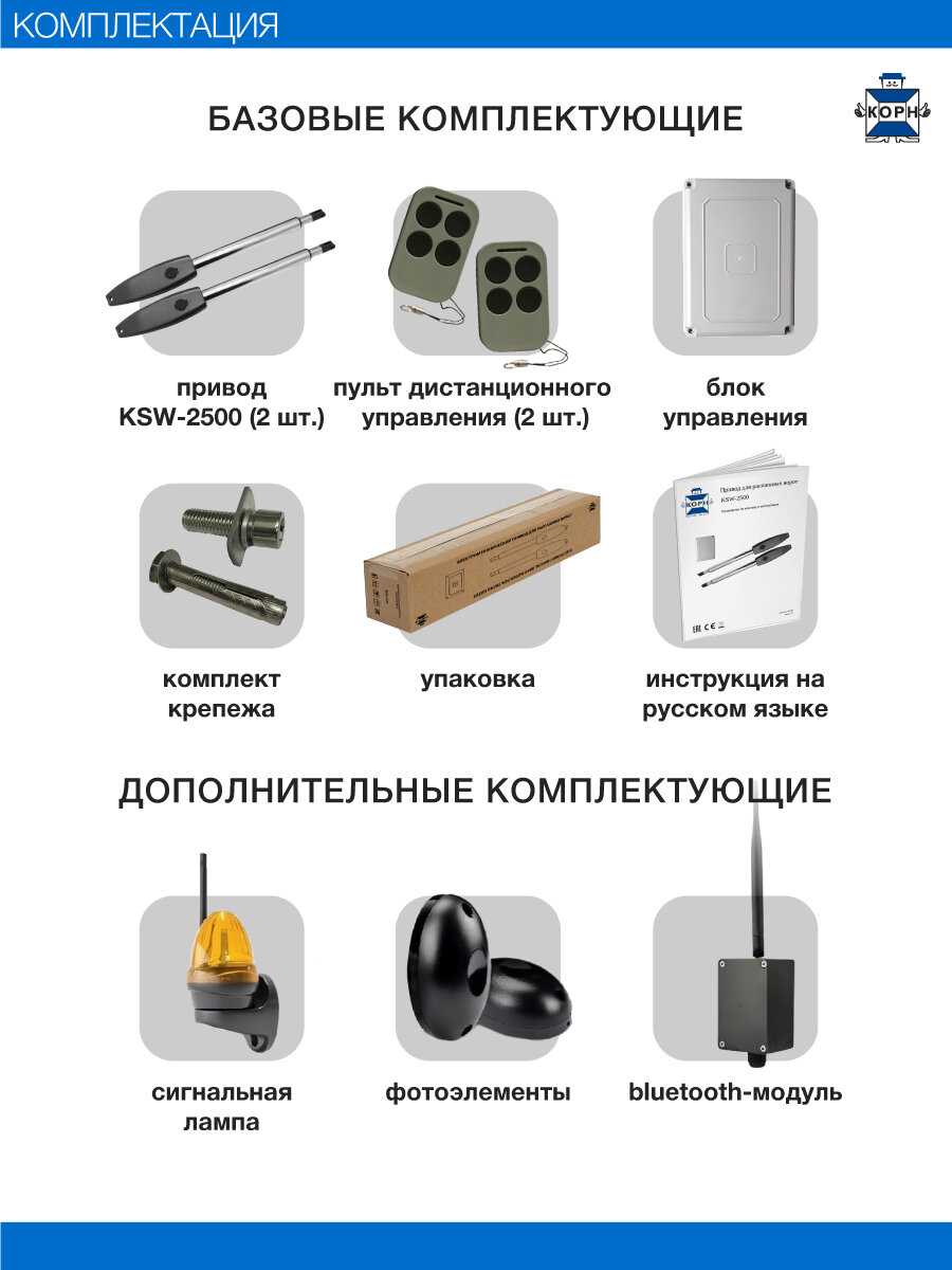 | Подробная комплектация | Привод KSW-2500 для распашных ворот, автоматика КОРН |