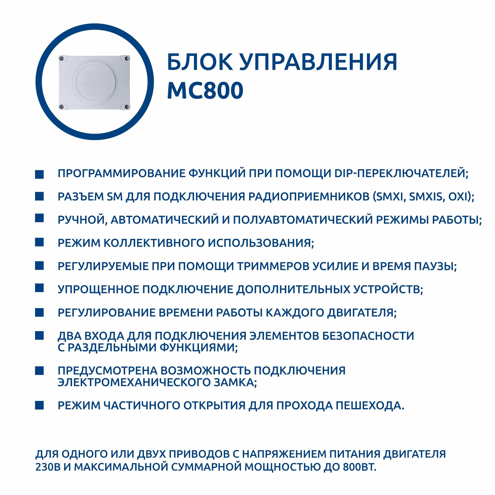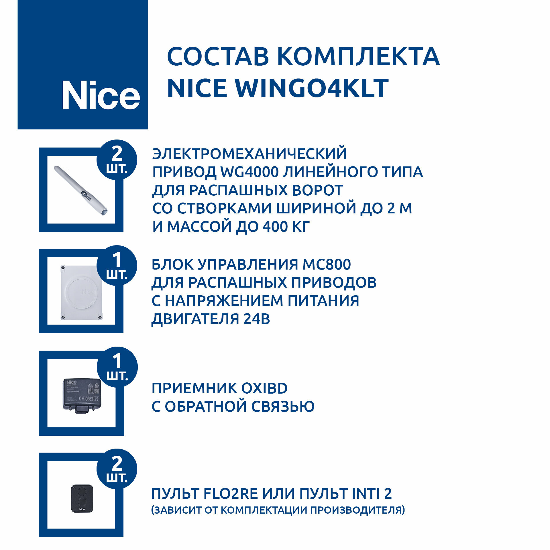 | Подробная комплектация | - Привод WINGO4 - 2 шт, - Блок управления - 1 шт, - Пульт ДУ 2шт, - Приемник с обратной связью - 1 шт, - крепежный комплект, ключ расцепитель 2шт, инструкция |