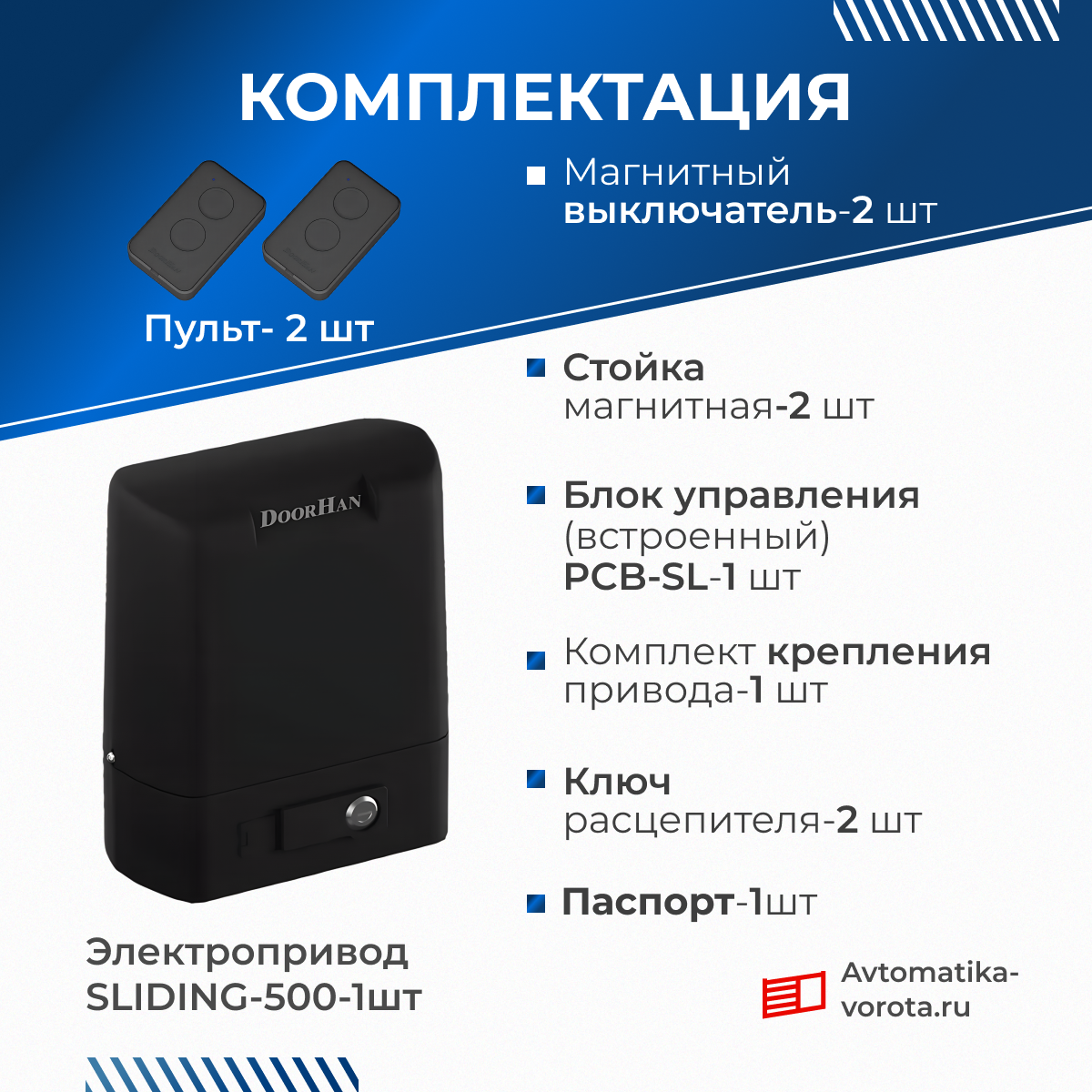 | Подробная комплектация | Привод SLIDING-500 для ворот весом до 500 кг - 1шт.; Концевые выключатели (открытие/закрытие) - 1 пара; Монтажное основание для бетонирования - 1 шт.; Комплект крепежа - 1 шт.; Ключи расцепителя - 2 шт.; Руководство пользователя - 1 шт.; Пульт 2-канальный DoorHan Transmitter 2PRO - 2 шт. |