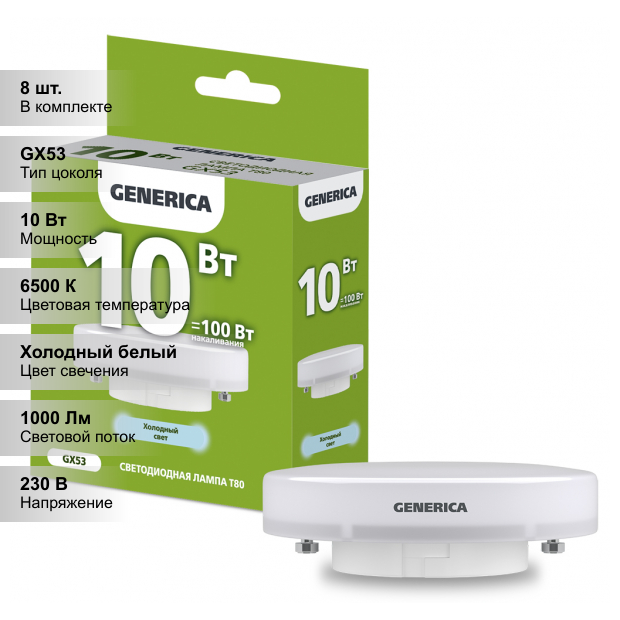 (8 шт.) Лампа LED T80 таблетка 10Вт 230В 6500К GX53 GENERICA информация: