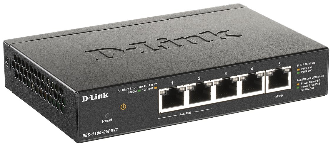 D-Link DGS-1100-05PDV2/A1A Настраиваемый L2 коммутатор с 5 портами 10/100/1000Base-T (2 порта PoE, 1 порт для питания коммутатора по PoE). (